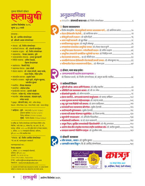 कै. डॉ. अरविंद संगमनेरकर यांनी वसा म्हणून चालवलेले वार्षिक. याही वर्षी नव्या स्वरूपात, तरीही तीच परंपरा पुढे नेत प्रकाशित होत आहे. वैद्यकीय क्षेत्रातली दैनंदिन गरजेची माहिती, विविध विकारांचं स्वरूप, त्यावरील संशोधन आणि उपाय हे वाचकांपर्यंत सोप्या भाषेत पोचवण्याचं कार्य ‘शतायुषी’ अंकातून केलं जातं.